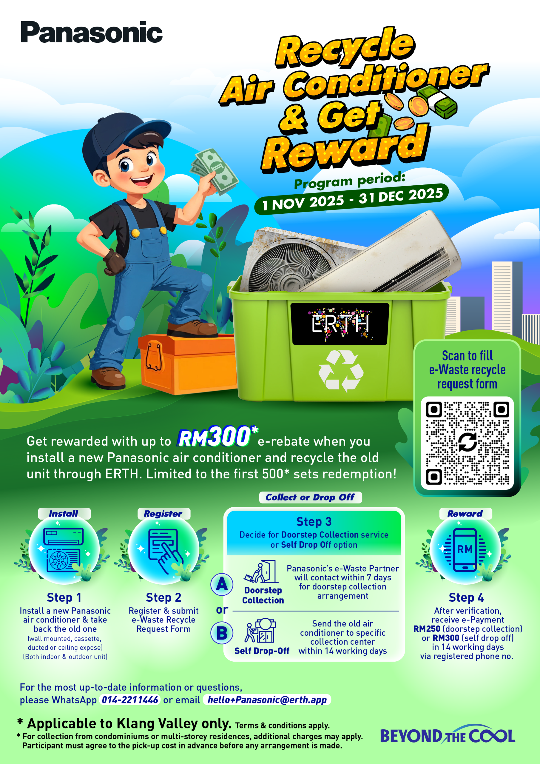 Panasonic Used Air Conditioner Collection Campaign (“Campaign”) is organized and promoted by Panasonic Air-Conditioning Malaysia (“PACMY”) in collaboration with Panasonic Malaysia (PM) e-Waste partner for individual installer (the “Participants”) to recycle their e-Waste.