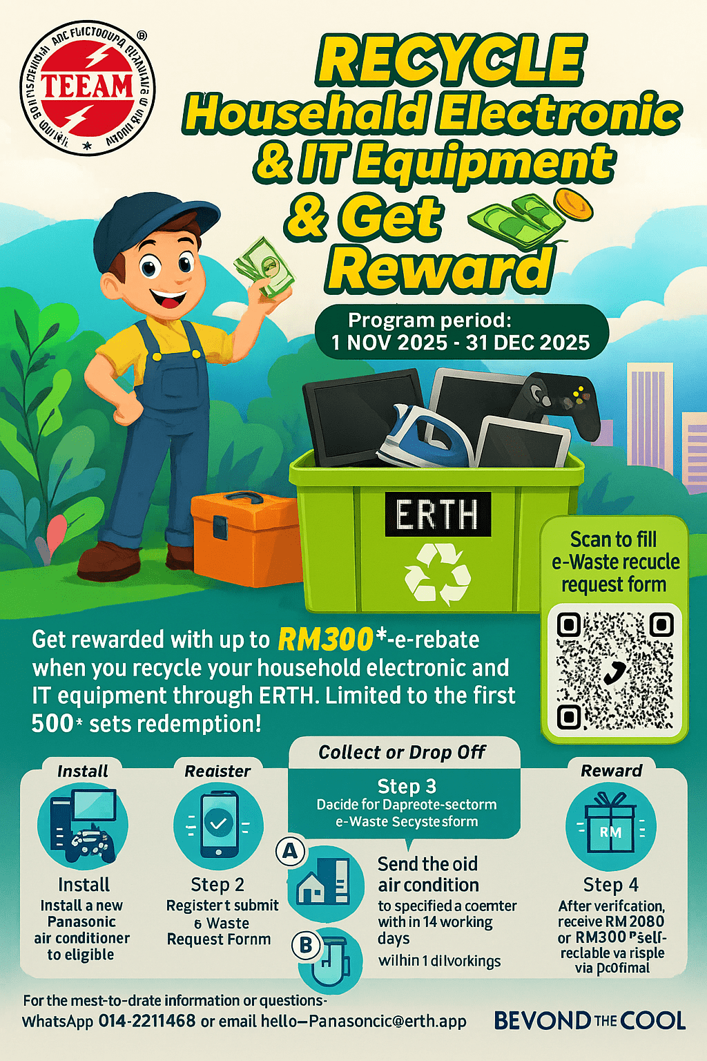 This campaign is open to all locals and foreigners INSTALLER(S) residing in Malaysia* to encourage e-Waste recycling to combat the effects of environmental pollution. As an electronic manufacturer, Panasonic Malaysia provides a sustainable way of disposing of digital and electrical items safely and responsibly.